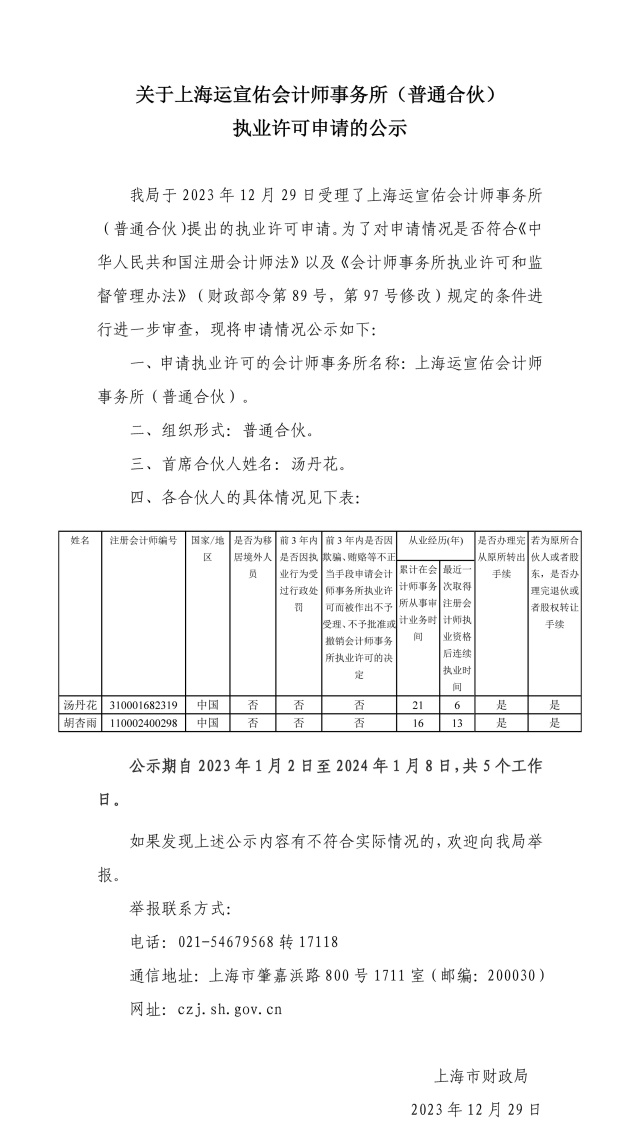 上海运宣佑会计师事务所(普通合伙)执业许可申请的公示