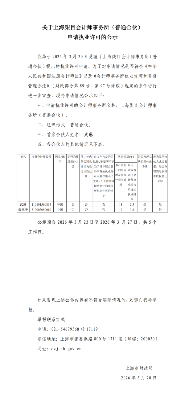 关于上海柒目会计师事务所(普通合伙)申请执业许可的公示